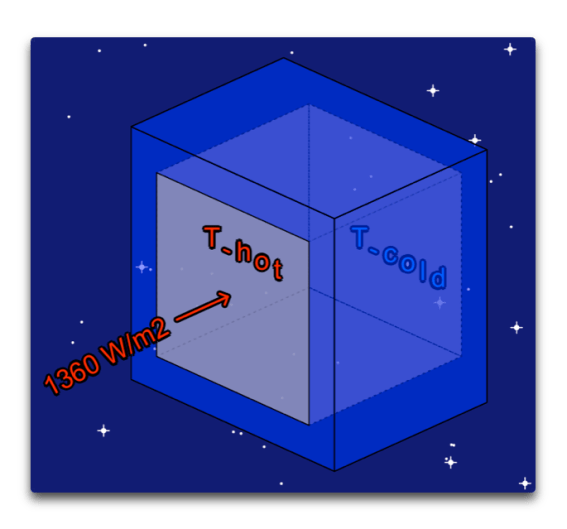 Determine 1. Setup for the thought experiment. The concrete block (grey) is a one-metre dice. The blue insulation prevents any warmth from escaping from the 4 sides. Nonetheless, the block is free to realize warmth by radiation on the entrance facet, and to lose warmth by radiation from each the entrance and the again sides.