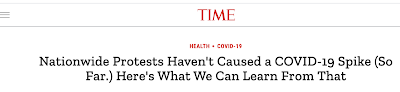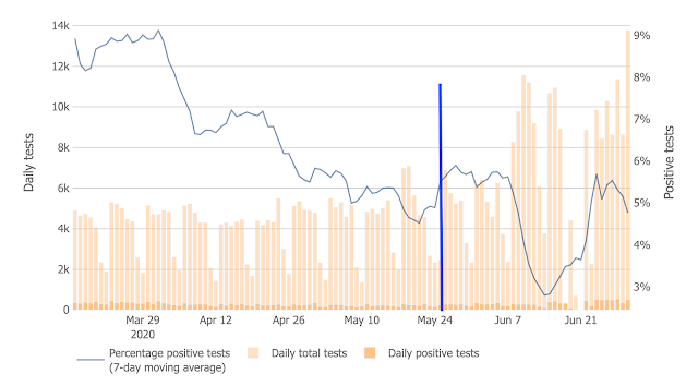 One commenter famous that share of constructive take a look at are rising not too long ago, indicating viral unfold. That is true. However as proven by the plots of constructive percentiles for Washington State (and every day assessments), the speed of positives fell for WEEKS after the protests (which began on the time of the blue line). The minimal was in mid-June. The constructive share is a really quick reacting measure of enhance of COVID-19 transmission and there’s NO trace of a surge with the arrival of the protests. Newer rises, in WA and for a lot of the nation, are related to lessening of restrictions and lockdowns.