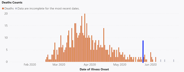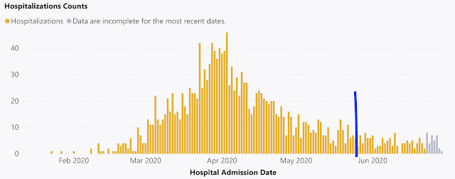 Think about Washington’s King County, a hotbed of protests beginning 26 Could (see under). Each hospitalizations and deaths confirmed no upward spike after the protests (the blue line exhibits Could 26th). We must always have seen a sign by now, for the reason that common time to signs is roughly 5 days.