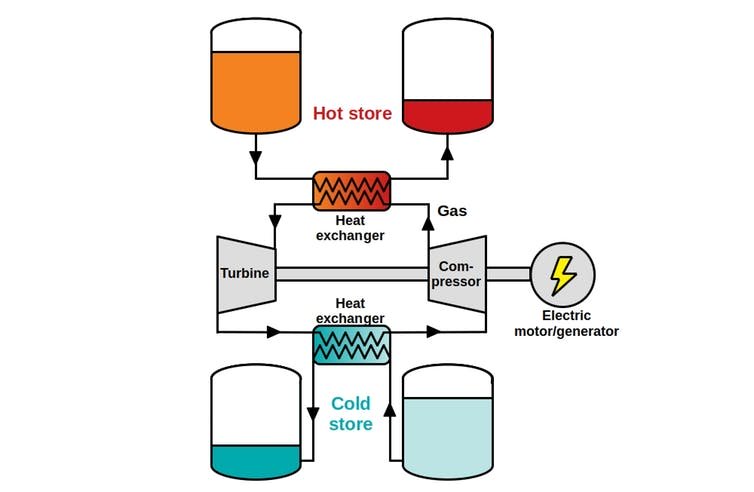 When wanted, the warmth is then turned again into electrical energy utilizing a warmth engine. These power conversions are completed with thermodynamic cycles, the identical bodily ideas used to run fridges, automotive engines or thermal energy vegetation.