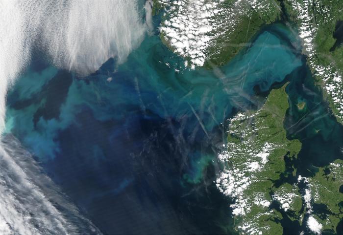 Ocean carbon storage is pushed by phytoplankton blooms, just like the turquoise swirls seen right here within the North Sea and waters off Denmark. NASA