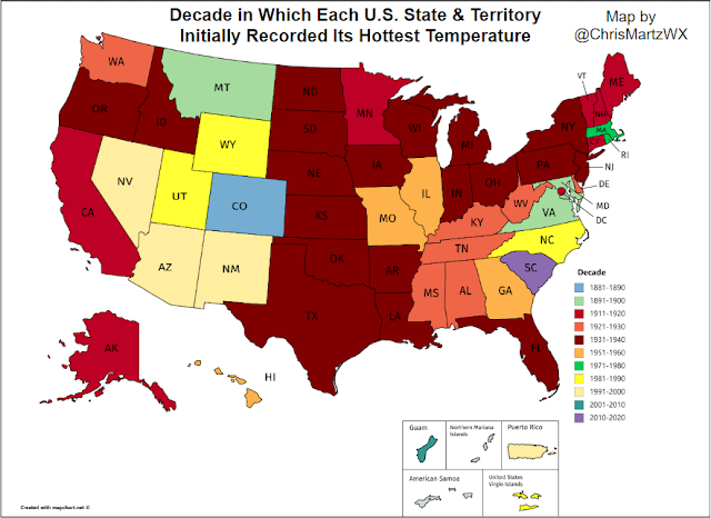 The map under (Determine 7) reveals the last decade by which every U.S. state (additionally contains Guam, Puerto Rico, the U.S. Virgin Islands, and Washington, D.C.) initially set their present hottest temperature within the file books, and as you may see, there’s an amazing quantity which might be coloured darkish pink (nearly brown), which point out the 1930s.⁴