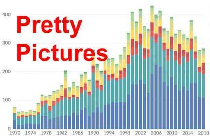 The significance of checking the info turns into shockingly clear. EMDAT information and Our World In Knowledge visuals are used — and reportedly trusted — by main media retailers — as proven on this graphic at Our World in Knowledge — New York Instances, The Wall Road Journal, Monetary Instances, CNN, PNAS, The Guardian, Science, BBC, Nature, and extra ….. you see the depth of their penetration into the media and journals. When these retailers use Our World in Knowledge graphics, or re-use the info underlying the graphics, it could be that the journalists don’t verify the info itself.