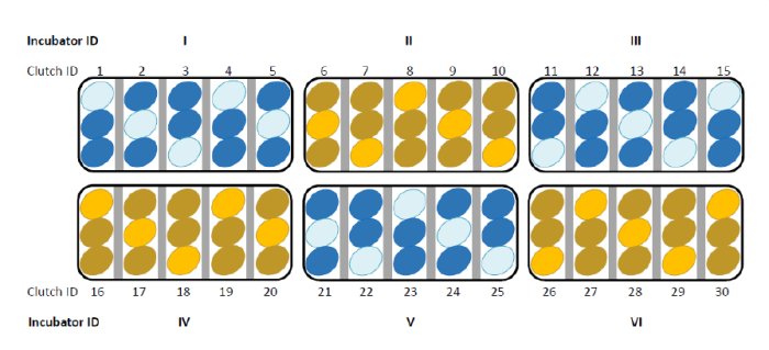 These eggs have been divided into clutches of three eggs, and positioned in incubators. They have been then assigned to certainly one of two teams – the experimental group (yellow within the picture above), or the management group (blue).