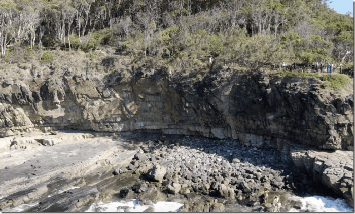 I’m standing on a wave-cut platform of sandstone bedrock with rectangular fractures, and pink iron oxide colouring.
