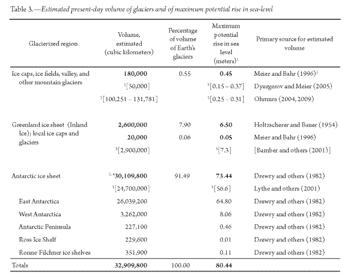 Determine 1. Desk Three from USGS Skilled Paper 1386-A-2.. 65 out of 80 potential meters of ice-related potential sea-level rise resides within the East Antarctic Ice Sheet.