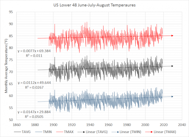 The closest factor to a big summer season warming development is within the minimal temperatures… Is a rise within the common summer season low temperature from 58 °F in 1885 to 60 °F in 2025 actually a transition from regular climate to “broiling, steamy climate”? Significantly since lower than 50 years in the past, we have been right here…